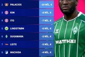 2、帕拉西奥斯(勒沃库森):-1000万欧元